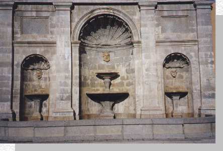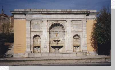 La fuente, de planta cuadrada, consta de tres cuerpos principales de granito y otros dos laterales de ladrillo, separados todos ellos por pilastras planas rematadas por capiteles toscanos. Los cuerpos principales presentan hornacinas formadas por veneras de cuarto de esfera en las que hay instalados unos mascarones por cuyas bocas cae aguas a unas pilas situadas en la parte inferior, dos en la hornacina central y una en cada una de las laterales. Las hornacinas laterales son de menor tamaño que la central, alcanzando la altura de la misma mediante unos tarjetones planos rehundidos. La fuente esta rematada por una cornisa corrida.